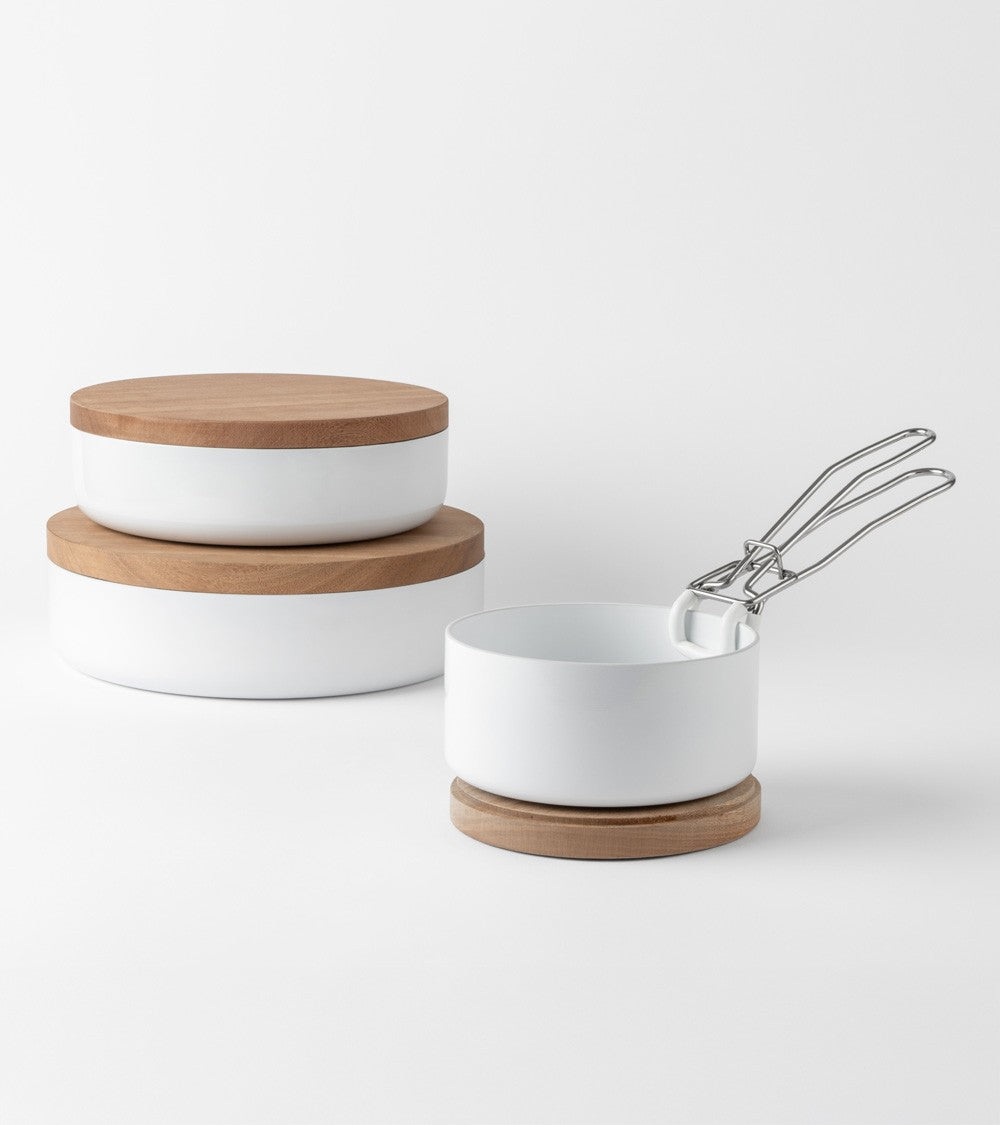 Il manico-pinza si può staccare; i coperchi in legno di mogano diventano sottopentola, piatti per servire formaggi e salumi, piccoli taglieri da cucina; gli stessi recipienti da pentole o tegami diventano ciotole, coppe, insalatiere per servire in tavola le pietanze.