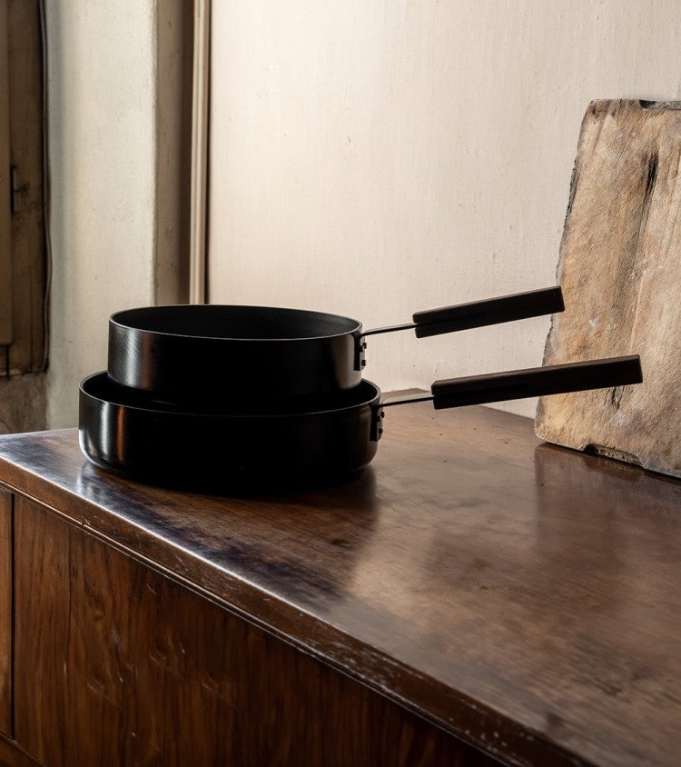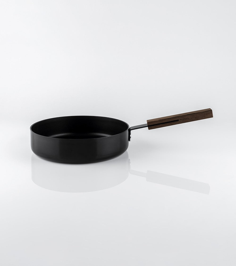 La ricerca estetica punta a un contrasto cromatico e materico: la linea Black è pensata nella nuance del nero sia per l’esterno, sia per l’interno, mentre i manici in legno wengé si abbinano con eleganza al corpo degli utensili. Il manico in wengé assume anche la funzione di perfetto isolante dal calore durante la cottura.