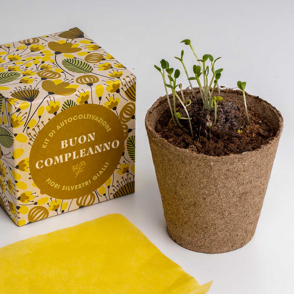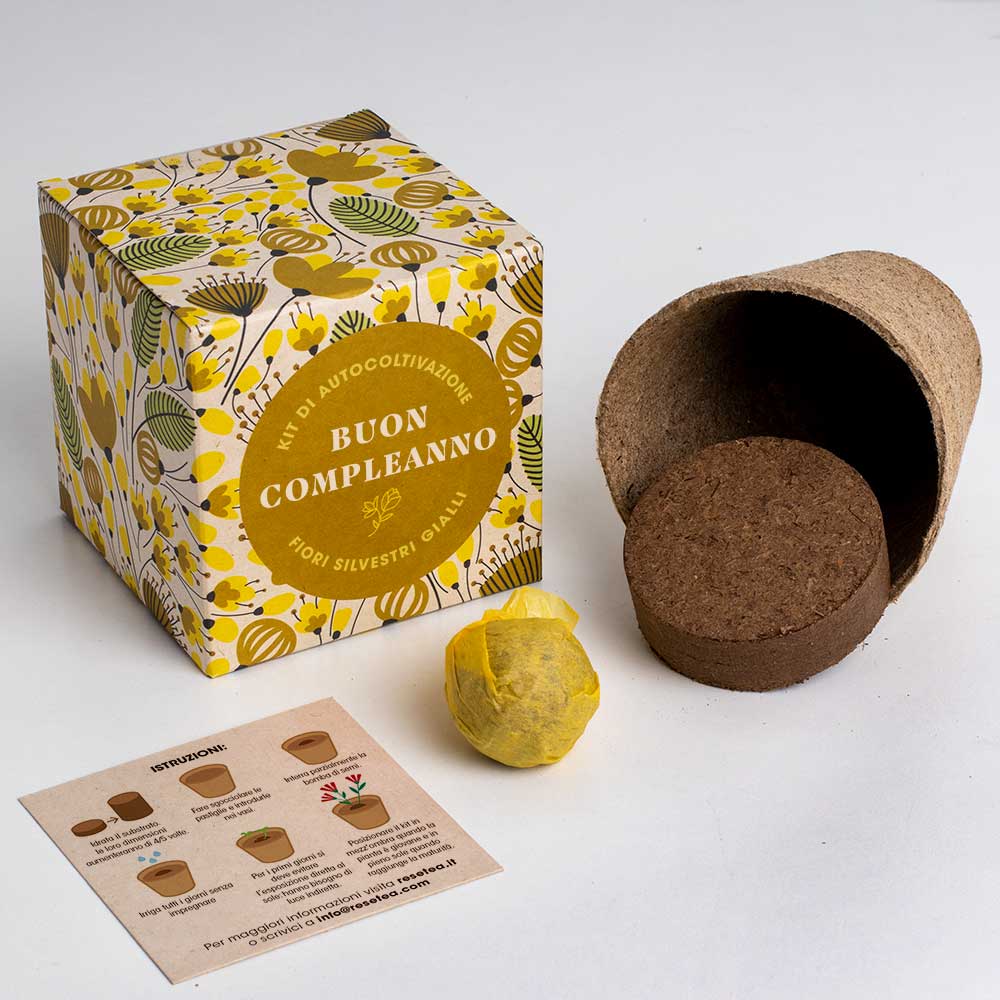 Il kit contiene 1 vaso di germinazione 100% biodegradabile, 1 compressa di terreno e 1 bomba di semi con fiori selvatici gialli (violaciocca dorata, finocchio e meliloto).