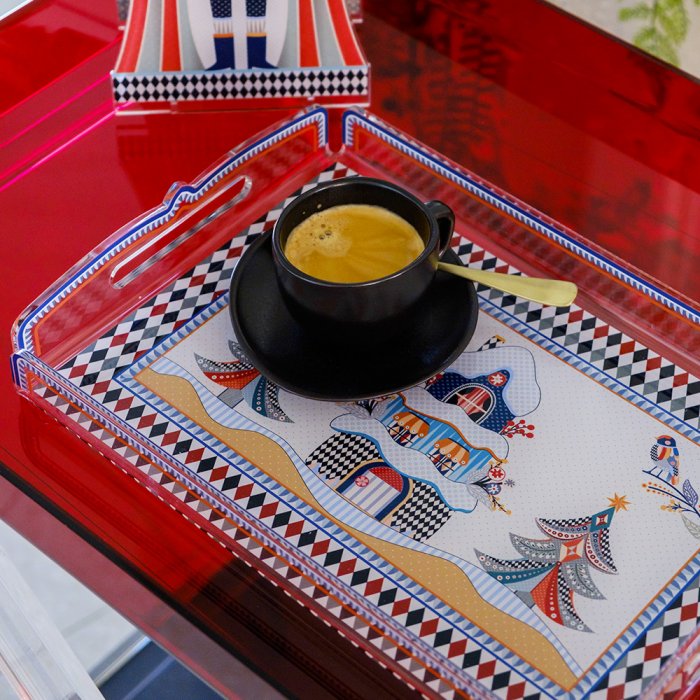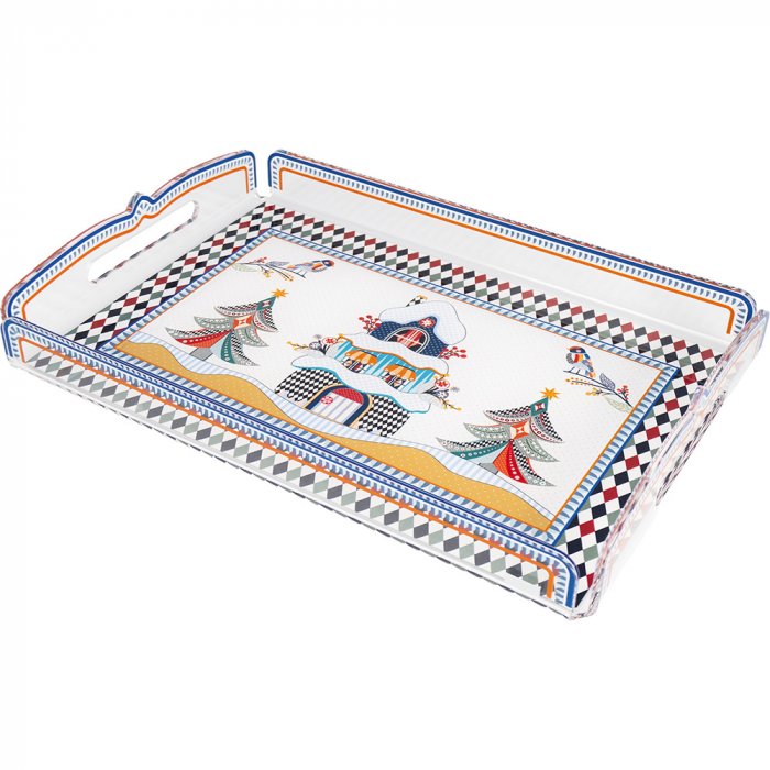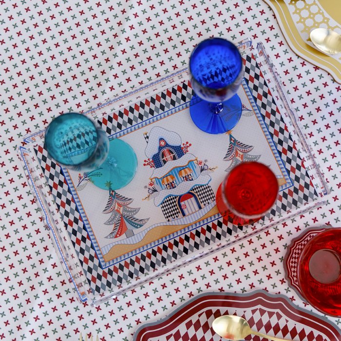 Realizzato con una nuova shape dei bordi e decorato con un’illustrazione originale che sfuma dai toni freddi del blu neve al calore dell’oro festivo, questo vassoio è pensato per creare atmosfera e accogliere i tuoi ospiti con eleganza.
