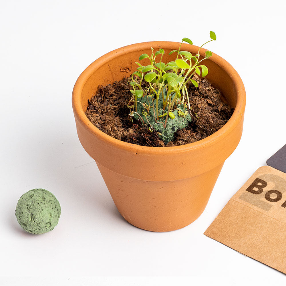 Le bombe di semi sono fatte a mano, utilizzando il metodo Nendo Dango, sviluppato dal giapponese Masanobu Fukuoka più di 70 anni fa. Questa tecnica naturale consiste nell’incapsulare i semi con argilla e materia organica. In questo modo preserviamo i semi per lungo tempo e otteniamo il successo nella germinazione.