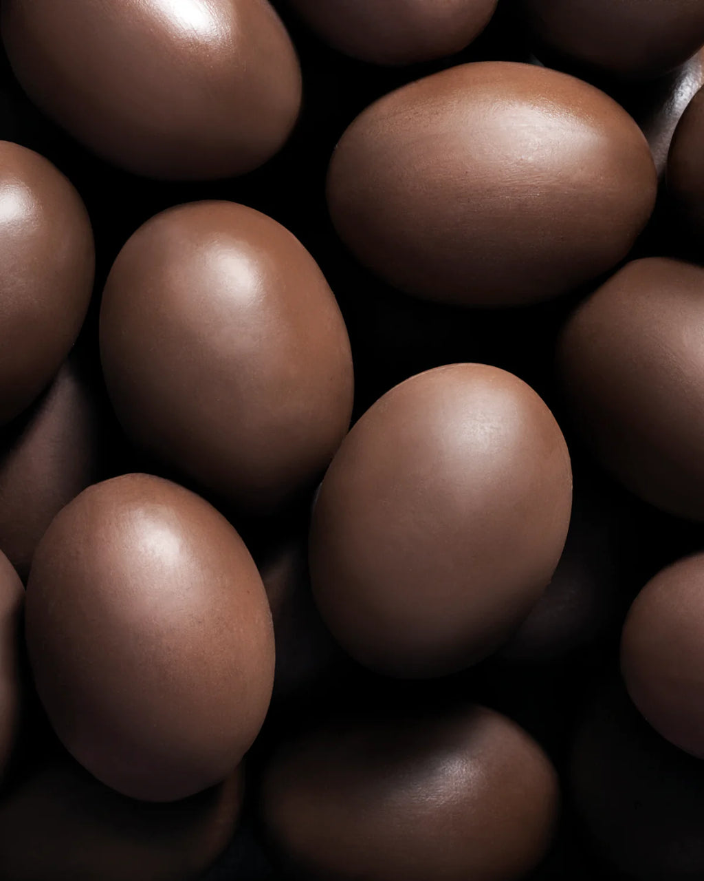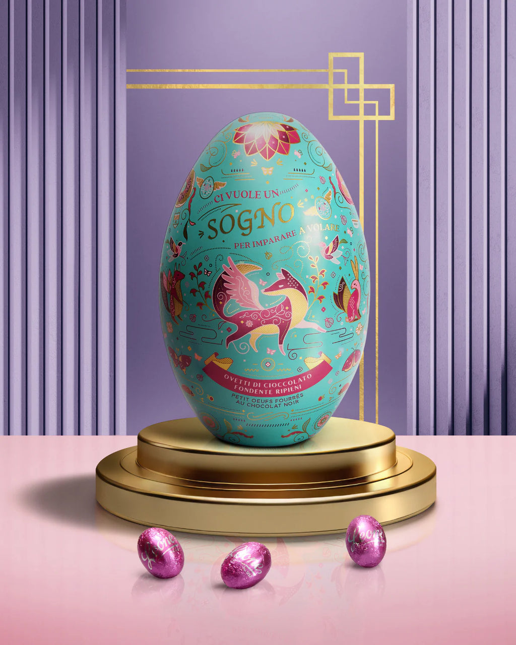 Per rendere ancora più speciale ogni momento, non poteva certo mancare un’elegante e ricercata latta a forma di uovo, dove il gusto intenso degli ovetti di cioccolato fondente si unisce alla magia di un dolce ricordo.