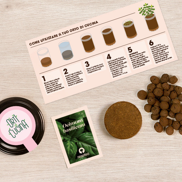 Contenuto: vaso di coltivazione, tavoletta di terriccio, argilla drenante, bustina di semi e istruzioni per l’uso.