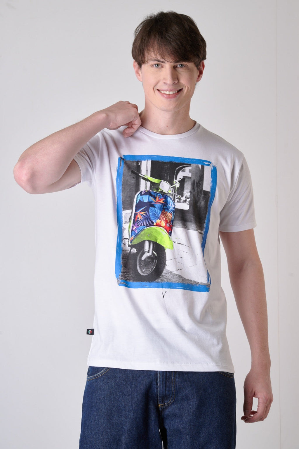 T-SHIRT BIANCA CON STAMPA VESPA E INSERTO IN TESSUTO RICAMATO E CONTRASTI GIALLO FLUO